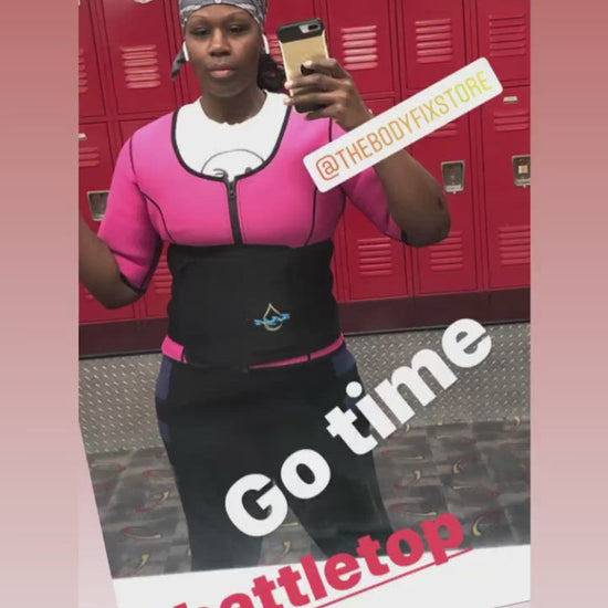 Combat obesity with the Battle Top! Targets upper arm, full back, belly, & love handles! Zip up extends to the waist and also has a Built-in sports bra & adjustable sweat belt! The suit also includes a front cellphone pocket. This sauna top has all you need & more!