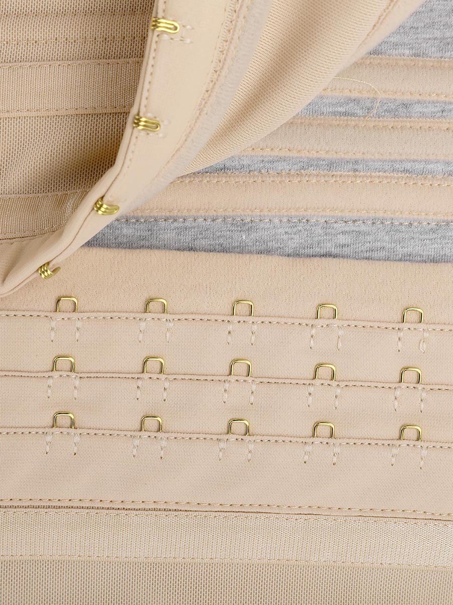 Double-layered abdominal compression with adjustable inner buttons and sleek outer zipper. Lifts lower tummy in place.